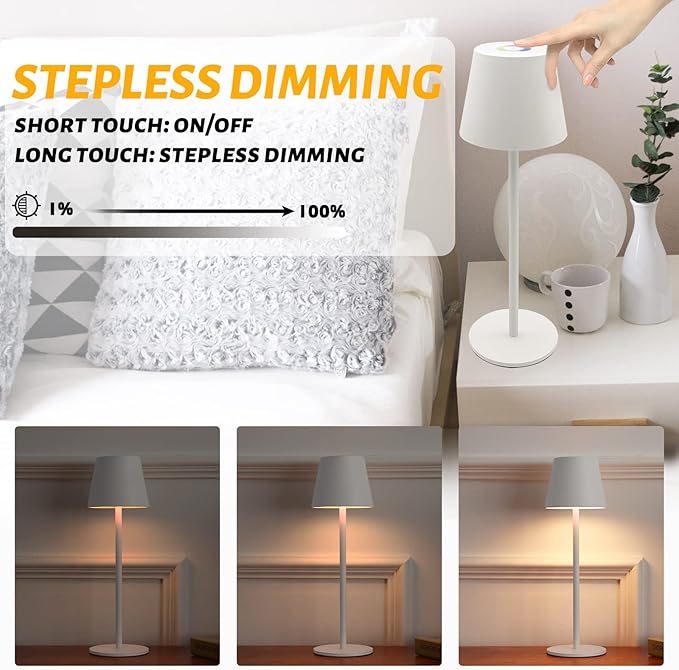 - 【Illuminate your World with Versatility】This portable, waterproof, and dimmable table lamp offers endless possibilities. Whether you're camping, relaxing in your backyard, or working at your desk, enjoy the freedom and convenience of cordless lighting. Its sleek design and customizable brightness make it the perfect addition to any space.
