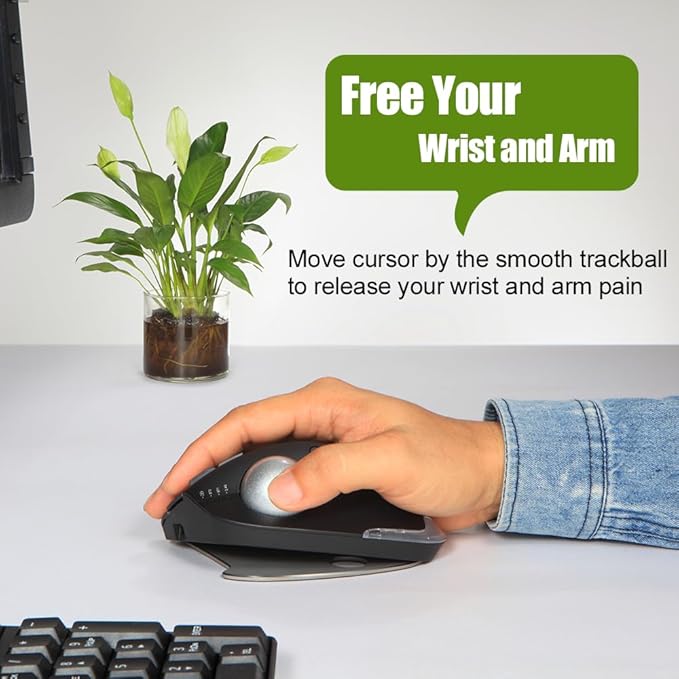 - 【Thumb Operation】Thumb-operated, you can precisely and smoothly move the cursor by rotating the trackball with your thumb without moving your wrist and arm. If you frequently use a mouse in your daily life, it will reduce muscle strain on your wrist and arm. The wireless trackball mouse can freely switch between 0-degree and 18-degree angle using a detachable aluminum alloy base, keeping your palm in a natural position for long-term use without fatigue.