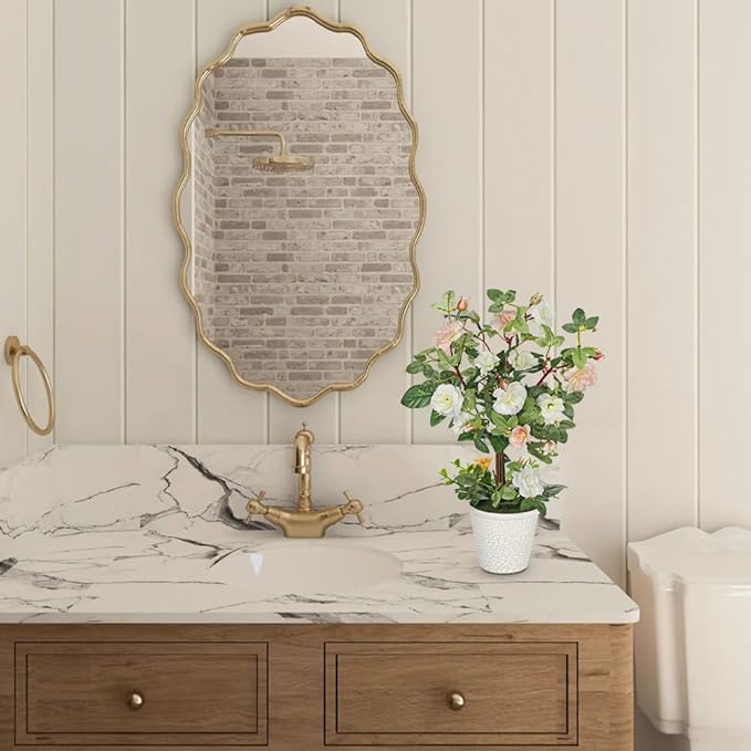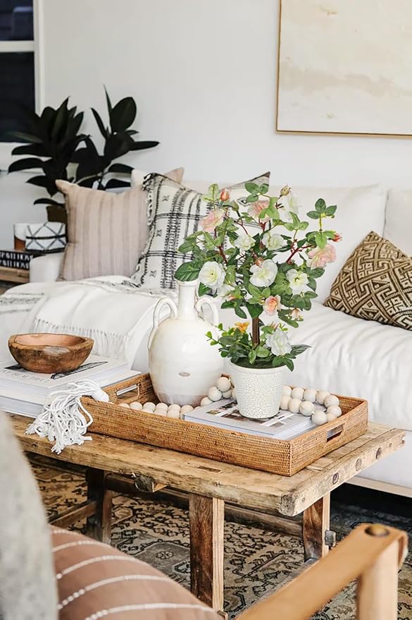 Hollyone Artificial Plants & Flowers in Vase White Camellia Roses Faux Flower Plant Arrangement with Pot Fake Rose Flowers Home Decor Office Bathroom Shelf Desk Table Decoration