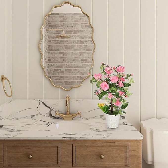 Hollyone Artificial Plants & Flowers in Vase Pink Camellia Roses Faux Flower Plant Arrangement with Pot Fake Rose Flowers Home Decor Office Bathroom Shelf Desk Table Decoration