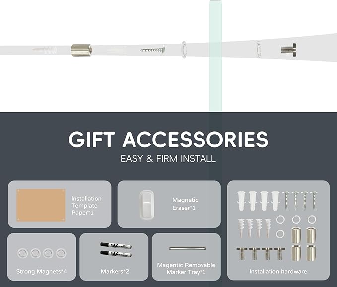 - Enhanced Functionality: Our magnetic glass whiteboard comes with 4 strong magnets, 2 markers, 1 magnetic eraser, and a magnetic removable aluminum marker tray, offering everything you need for an efficient and organized workspace. The powerful magnets ensure your documents stay securely posted.
