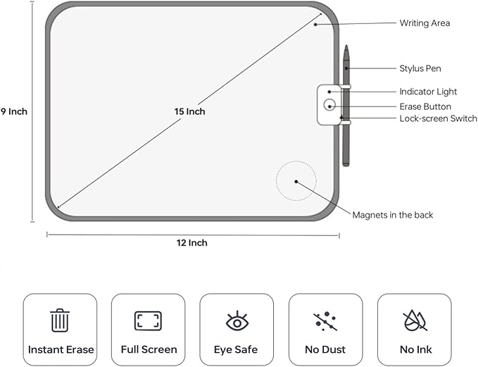 - USB-C RECHARGABLE & SMOOTH WRITING EXPERIENCE: This 15 Inch writing tablet is perfect for jotting down household reminders, grocery lists, or family messages and is a great alternative to paper notepad or dry erase board.