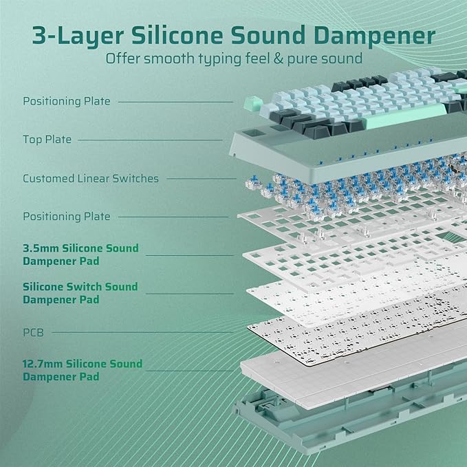 - Excellent Silicone Sound Dampening — Triple-Layer silicone dampening structure significantly minimizes hollow sounds and cavities noise, delivering a super smooth and quiet typing experience. Complemented by oil-resistant PBT keycaps for enhanced typing comfort.
