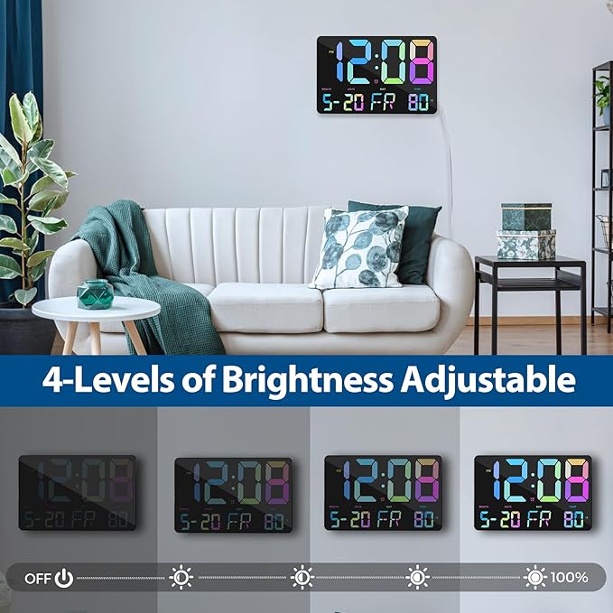 - 【4-level adjustable brightness】The digital desk clock large display has a 4-level adjustable brightness display. You can easily set the screen to your favourite brightness by using the remote control or opening the "auto light sensitive function". The lower brightness levels make it the perfect digital calendar clock for your bedroom without disturbing your sleep