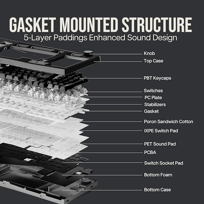 - 【Gasket Mount, PC Plate & Enhanced Sound Design】 Designed for a superior typing experience, the Feker Alice98 mechanical keyboard features a gasket mount structure with a PC plate, offering a soft, consistent typing feel across the entire keyboard. To further enhance the typing experience, the keyboard includes sound-improving materials such as Poron sandwich foam, an IXPE switch pad, PET film, EPDM socket foam, and case foam. These layers work together to minimize noise and provide a rich, satisfying typing sound, making every keystroke a pleasure.