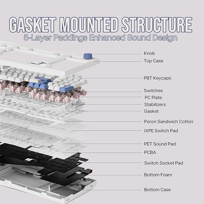 - 【Gasket Mount, PC Plate & Enhanced Sound Design】 Designed for a superior typing experience, the Feker Alice98 mechanical keyboard features a gasket mount structure with a PC plate, offering a soft, consistent typing feel across the entire keyboard. To further enhance the typing experience, the keyboard includes sound-improving materials such as Poron sandwich foam, an IXPE switch pad, PET film, EPDM socket foam, and case foam. These layers work together to minimize noise and provide a rich, satisfying typing sound, making every keystroke a pleasure.