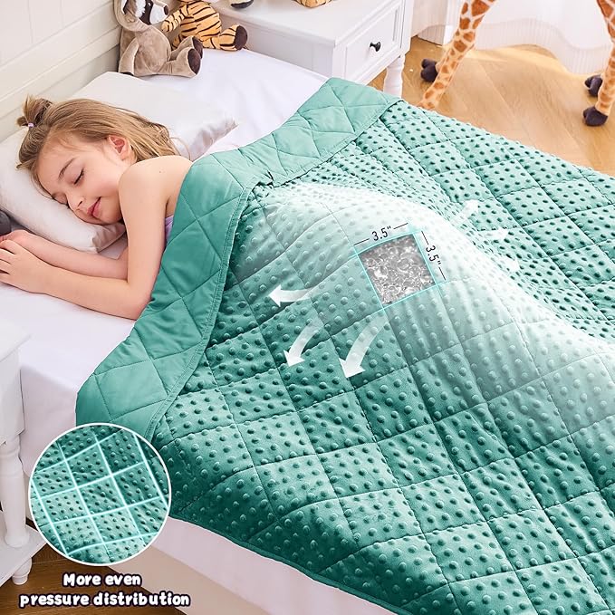 - CHOOSE RIGHT SIZE: As a weighted blanket with throw size, kids would be relieved by the warmth hug provided by its gentle pressure of evenly distributed glass beads of without soreness in muscles and bones. Choose the right size to get a comfortable experience. Research recommends kids weighted blanket should be a minimum of 10% of your kids' weight. If your kids are trying for the first time, a lighter heavy blanket is more suitable.