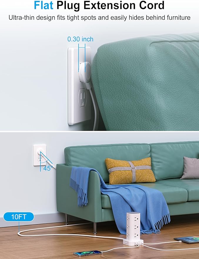 - Flat Plug Power Strip & 10 FT Extension Cord: With a mere 0.30-inch ultra-thin flat-head plug design, this power strip sits flush against the wall and effortlessly fits into tight spaces behind sofas, nightstands, bookshelves, and headboards. The 45° right angle design creates an extra space for other plugs below without blocking. With a 10FT extension cord that's long enough to give you the freedom to use it anywhere - homes, offices, or college dorm rooms