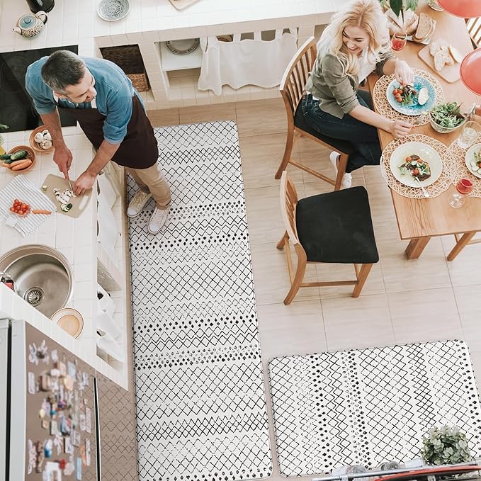 - Versatile:Geometric farmhouse style kitchen rug easily to match your kitchen decor,bright your home.Soft thick foam provides ample support for standing in kitchen sink,laundry room, office,bathroom,dinning room,or any other high-traffic area