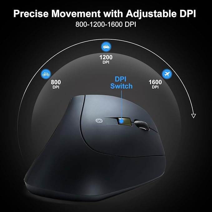 - 3 Adjustable DPI: Switch between DPI levels 800 / 1200 / 1600 to adjust mouse responsiveness depending on your needs. And Blue LED tracking technology, enabling you to use the wireless ergo mouse on a wide range of surfaces.