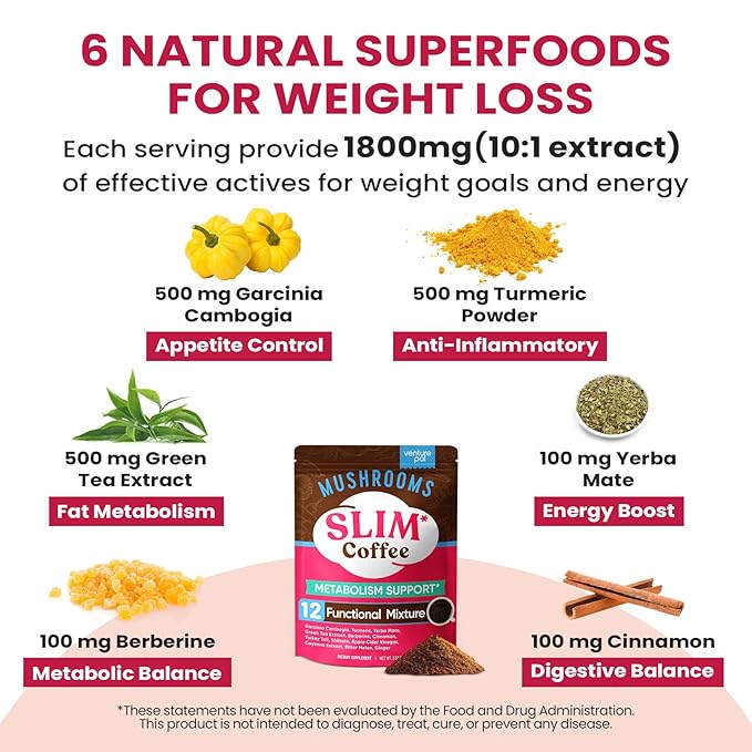 Venture Pal Slim Mushroom Coffee for Weight Loss, Instant Coffee with Berberine, Cinnamon, Yerba Mate, Turmeric, & More, 1800mg(10:1) Extract for Diet Support & Metabolism Boost - 40 Servings