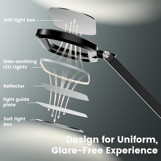 - Advanced Eye-Care Desk Lamp – Reduce Eye Strain: LitONES LED desk lamp utilizes advanced edge-lit technology, Anti-glare technology and diffused light to provide uniform and soft illumination. It creates a 3D ambient light that reduces environmental brightness differences, minimizing eye fatigue from frequent pupil dilation, perfect light for video recording, video calls, video conferencing, home office, learning, reading, and content creation