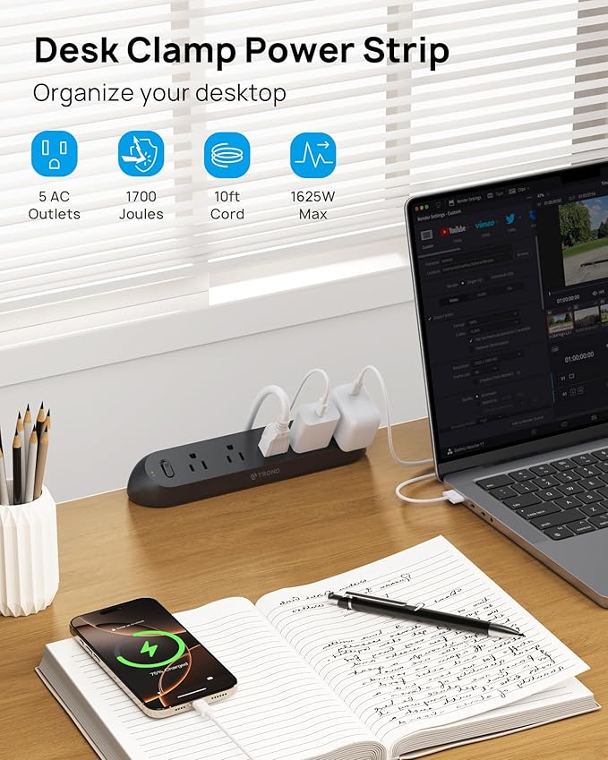 - Power Strip for Desk: This desk clamp surge protector features 5 widely spaced outlets and 1700J surge protection, allowing you to power and charge up to 5 devices. Maximum power: 1625W, 125V/13A, AC 100-250V. This desk surge protector is ideal for office desks, standing desks, nightstands, craft tables, nail tables, and more