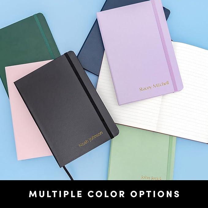 - Personalized Paperage Notebook: Your favorite journal now offers custom options for embossed gold text. Click “Customize Now” to add your name for a personal touch that stands out. The classic notebook has a leather water-resistant hardcover, 5.7 x 8 inches, 160 college-ruled pages, an expandable pocket, a ribbon bookmark, and elastic closure.