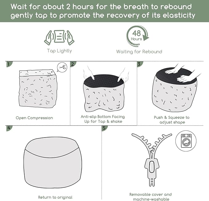 - For convenience and ease of use, this pouf ottoman comes pre-filled with memory foam chunk pouf filler, which can be easily inserted through the large round opening on the bottom with double zippers