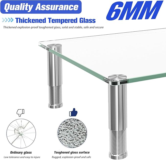 - 6mm Tempered Glass: Constructed of 6mm premium tempered glass and with a maximum weight capacity of 88 lbs, this monitor stand provides stable support for your device,Our tempered glass construction gives you peace of mind,This process strengthens the glass, making it more resistant to impact and thermal stress, ensuring longevity and safety