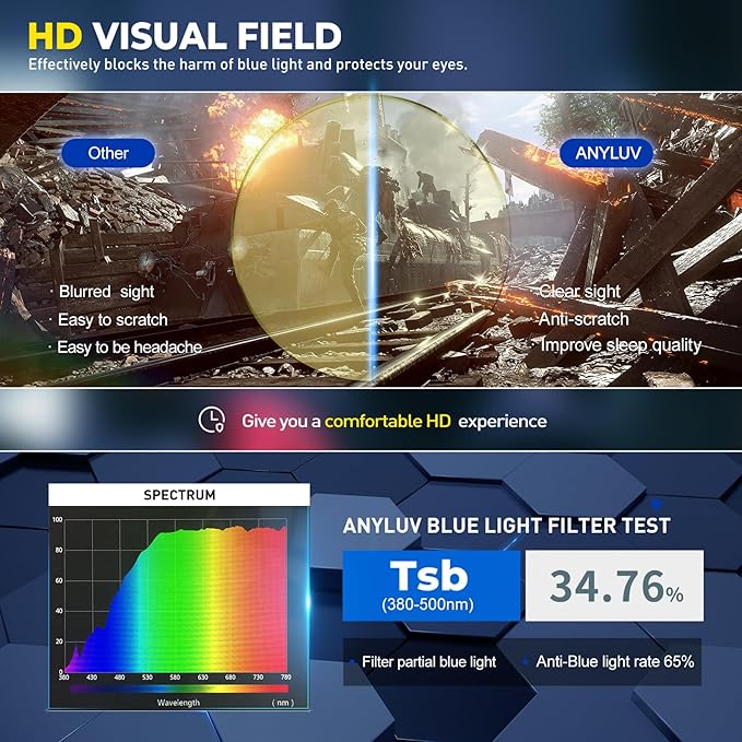 - UV400 Blue Light Protection: ANYLUV blue light glasses are specifically designed for women and men, featuring a 65% blue light blocking capability. These glasses efficiently filter harmful high-energy blue light emitted by screens, ensuring that your eyes remain comfortable without sacrificing your exposure to beneficial blue light.