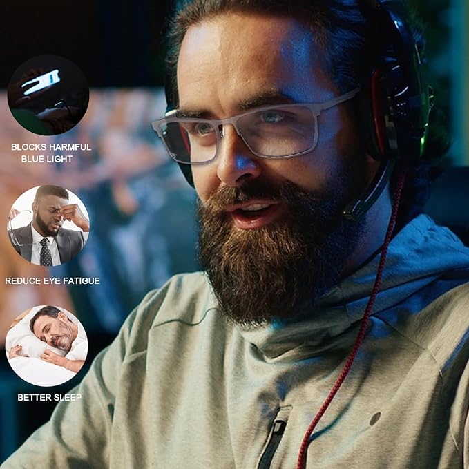 - 【Comfortable Design】A more timeless style of blue ray glasses than the traditional rectangular frames will not be found. The spring hinges of blue screen glasses can sits perfectly on all face shape, reduces the squeezing to the head. Rubber nosepads also keep the mens and women blue light glasses in place and prevent frames from pinching on the bridge of the nose. Upgraded ultra-light glasses frame won't cause too much pressure on your ears, even after wearing these clear lens glasses all day.