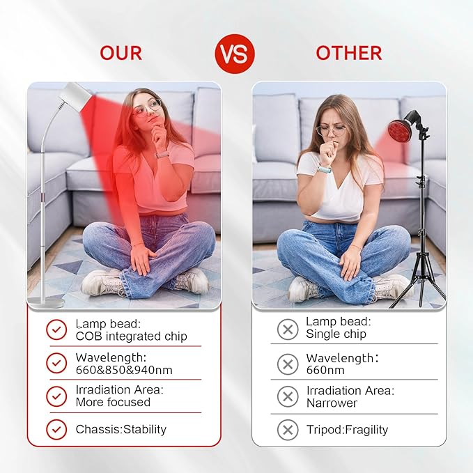 - Innovative Red Light Therapy Device: Our red light therapy lamp features an adjustable telescopic pole, allowing for versatile use at various angles and heights. It's designed with a COB chip that enhances the focus and efficacy of infrared and LED light therapy, enabling you to enjoy personalized sessions anytime, anywhere in your home