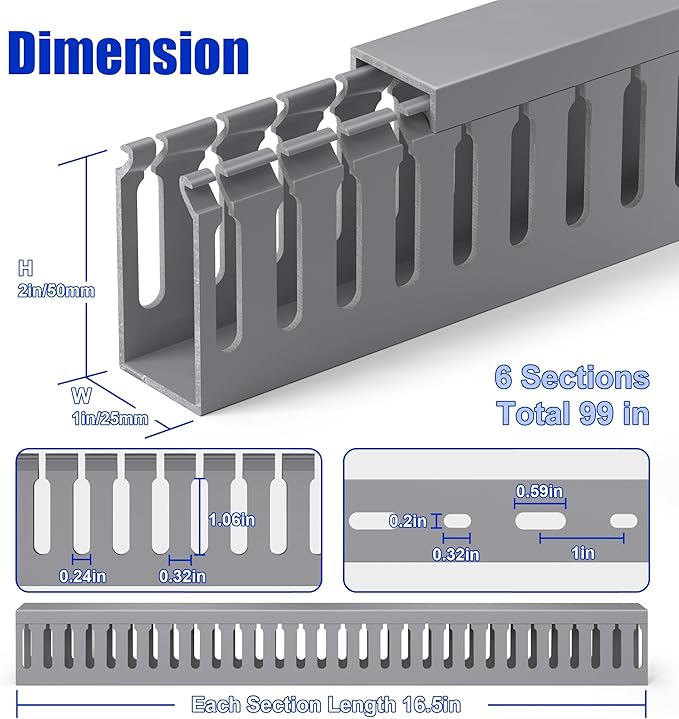 - Specification: Standard open slot cable raceway teeth W0.32in/8mm, wiring outlet width 0.24in/6mm. External dimension: H2in x W1in. Includes 6x L16.5in cable raceways; Its Large capacity can accommodate up to 20 network cables