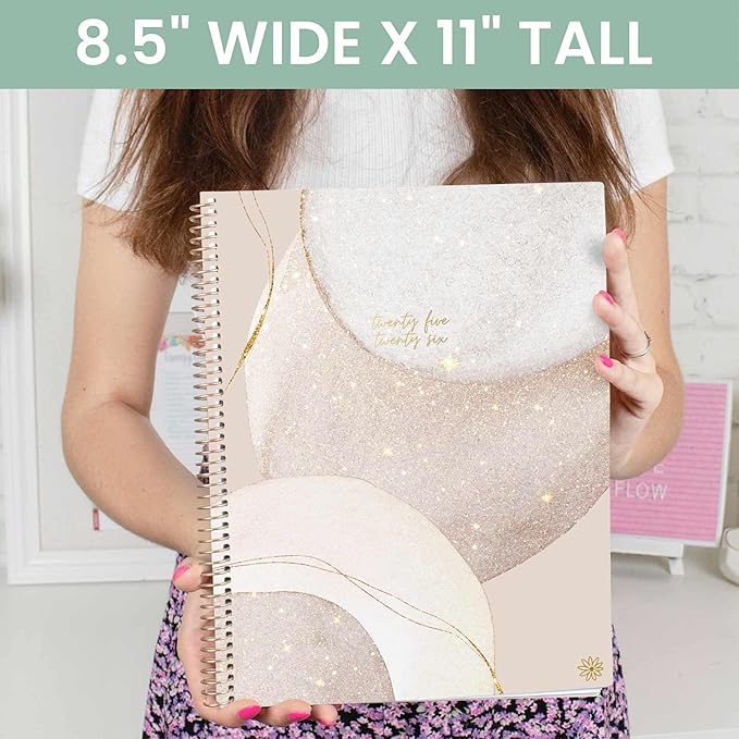 - DELUXE DESIGN ELEMENTS: This planner 2025-2026 has soft yet durable covers, monthly tabs, and 100gsm bright white, no-bleed paper. The metal spiral binding allows your planner to lay flat, and two vertical cover pockets provide a secure place for loose papers. Also includes a FREE magnetic bookmark and sticker sheet!