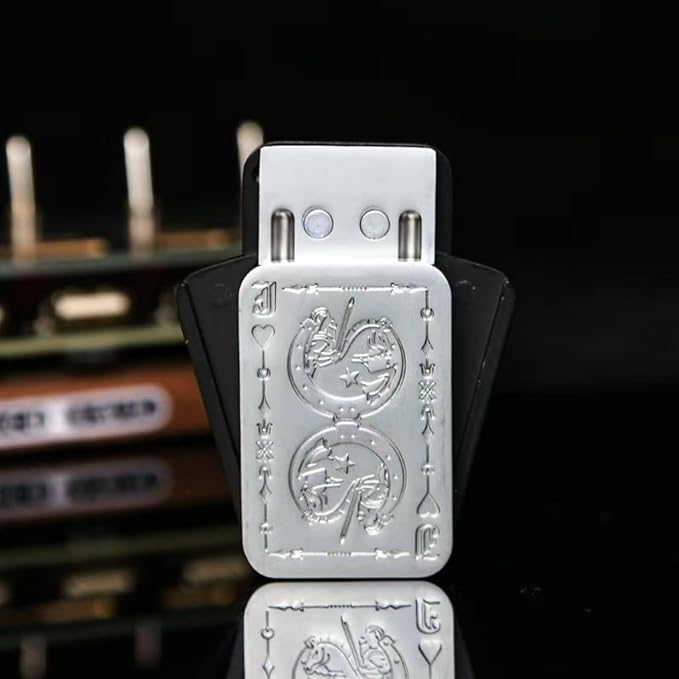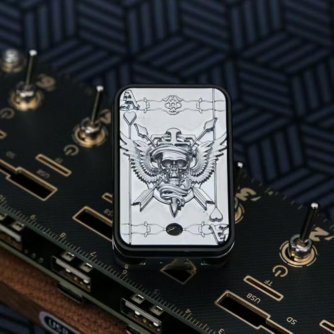 - Striking Skull & Ace Design – Features a bold raised skull engraving on the front and a stylish Ace motif on the back. Inspired by poker push cards, the slider fans open with a dramatic effect—eye-catching and addictive to play.