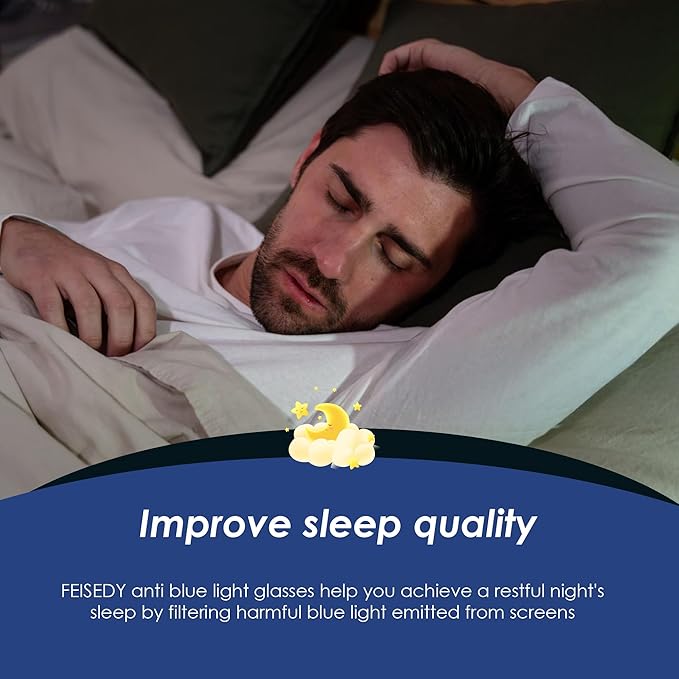- Anti-Blue Light Lenses - FEISEDY amber blue light blocking lenses help you block almost 99.9% harmful blue light (Yellow lens help you block 65% harmful blue light) reduce eyestrain and headache, protect your eyes, improve your sleep quality. Bring you better sleep and better spirits.