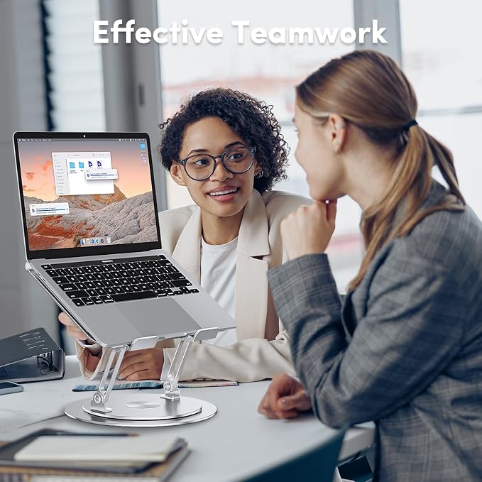 - 360° Rotation: This is a rotatable laptop stand with a dual-axis design that attaches to the base and allows you to rotate your laptop to any angle. This gives you a lot of flexibility in your work position and is suitable for sharing content in meetings or group project communication.