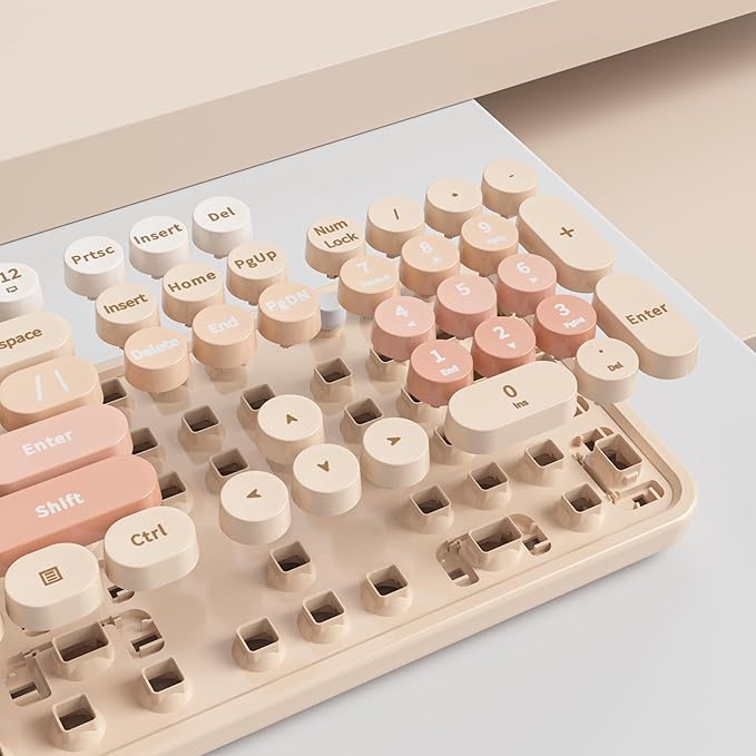 - 【Full-Size keyboard with Round Keycaps】 Adopts noise reduction keys, a square mechanism under each key improved stability, quick rebound and no delay. The retro round keycap matches the shape of your fingertips, and it is comfortable to press, just like typing on an old-fashioned typewriter, and your hands will not feel tired during long-term office work