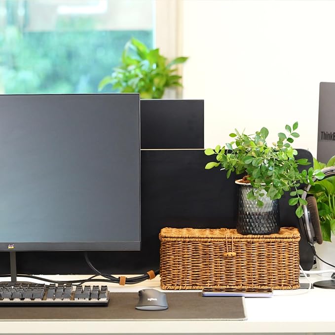 - Aesthetic & Versatile: Our handwoven cable hider, featuring realistic colors, two open low wire slots for maximum storage, seamlessly blends into any room home office as a nice desk organizer. Smooth finished rattan protects furniture from scratches
