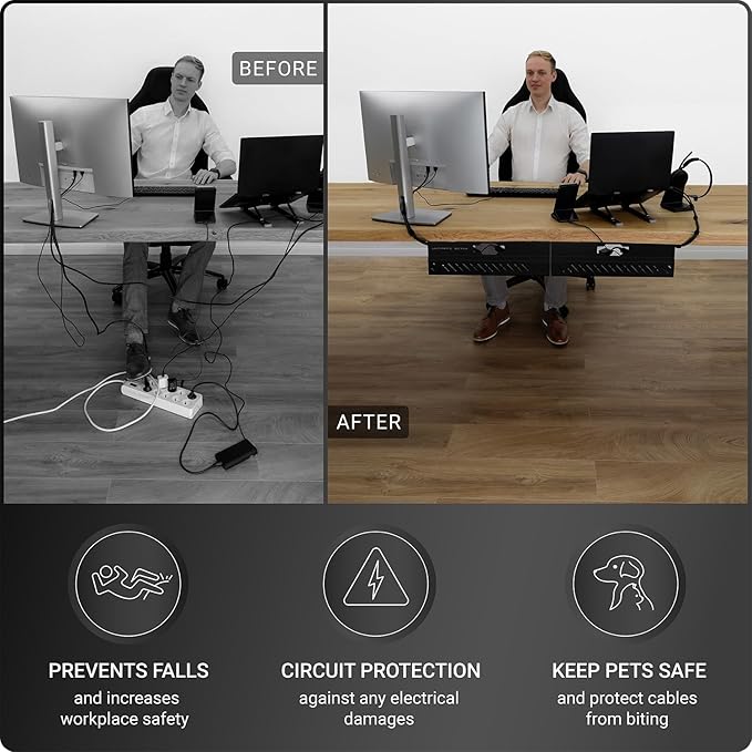 - Extra large: The cable management under desk has an extra-large and stronger design than many commercially available cable ducts. Tall and wide plugs or power supply units can be easily accommodated in this cord organizer for desk