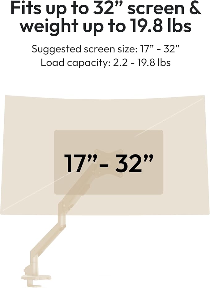 - Supports monitors up to 32 inches and 19.8 pounds: Accommodates a wide variety of monitors for a perfect fit. The VESA plate accommodates 75x75mm and 100x100mm mounting patterns.