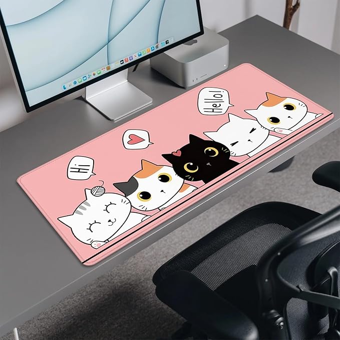 Cute Cats Desk Pad Mouse Pad,Cute Cartoon Lofi Cats Pink Mouse Mat Large,Stitched Edges Non-Slip Waterproof Rubber Base Mouse Mat for Office Home Work Gaming(27.5 x 11.8 in)