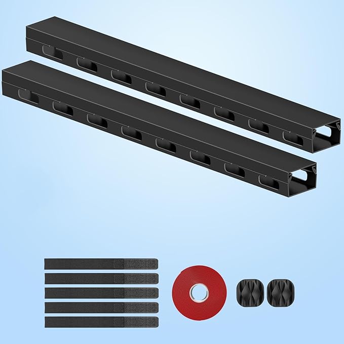 - 【What’s Included】This desk cable management kit includes two black cable raceways, each measuring 15.4" x 1.6" x 0.98", one adhesive tape, two wire holders, and five cable ties. It’s perfect for concealing AWG cables, HDMI cables, Ethernet cables, USB cords, and power cables, offering comprehensive cord management solutions.