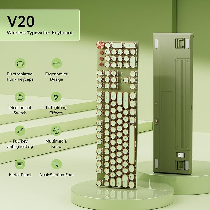 EWEADN V20 Typewriter Keyboard Wireless, 104 Keys Typewriter Style Mechanical with White Backlit, Media Knob, Pink Switch 2.4G/Bluetooth/USB-C Wired Retro Full Size Keyboard for Windows/Mac/PC-Green