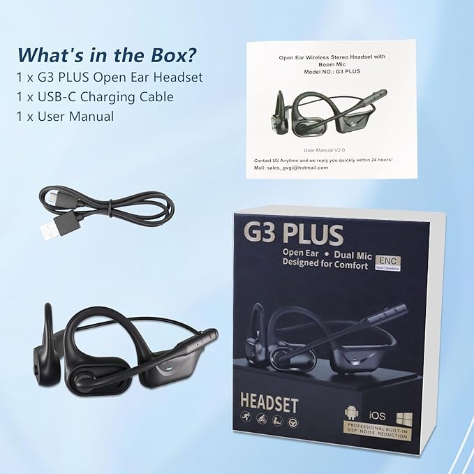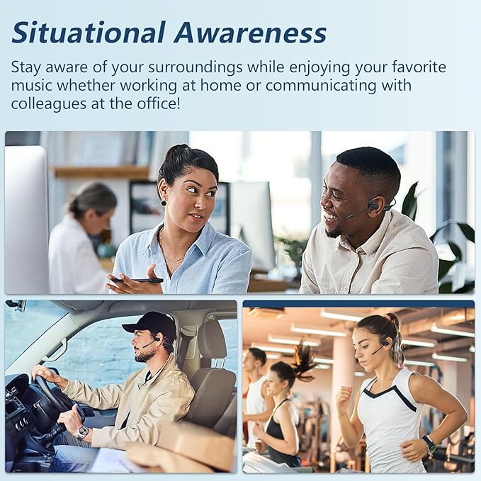 - [Bluetooth 5.4 & Dual Connection] Bluetooth headset with microphone noise cancelling supports connecting two devices at the same time to ensure that no call is missed. Upgraded version of Bluetooth 5.4 signal model transmission is stronger, not tangled, more stable connection. Open ear headset widely compatible phones/PC/computer/laptop/tablet/watch etc. Bluetooth headset with mic easier to carry, you can hang it around your neck and take it anywhere you want to go when not in use.