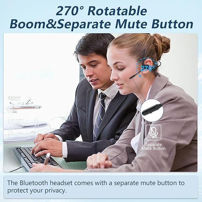 - [Noise-canceling Mic & Mute Button] Bluetooth headset with DSP and CVC.8 noise cancellation technology that filters out 95% of background noise to provide clear audio for calls and music. Bluetooth headphones flexible boom can be rotated 270° to adjust to the best position to better pick up your voice, ensuring that others can hear you clearly and improve call quality. In addition, open ear wireless headset with separate mute button to better protect your privacy when on a call.