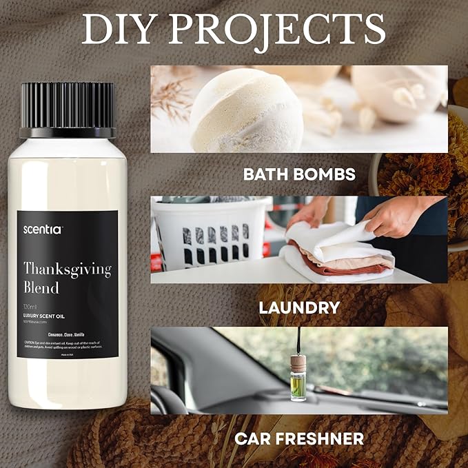 - 5. Made in the USA & Safe for Home Use Proudly made in the USA, our oils are IFRA-compliant and formulated specifically for home fragrance, ensuring a safe and high-quality aromatherapy experience.Cozy Holiday Bliss 🍂 Fill your home with the warm, festive aroma of Scentia Thanksgiving Blend Essential Oil. A premium mix of cinnamon, clove, vanilla, and sweet coconut, this 120ml blend is perfect for diffusers, candles, soaps, and DIY crafts. Proudly made in the USA and IFRA-compliant, it delivers a safe, long-lasting fragrance that transforms your space into a cozy autumn retreat — ideal for seasonal décor and holiday gifting.tive environment.