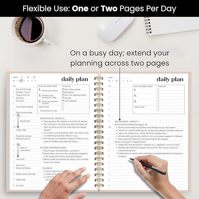 - EXTRA LARGE SIZE DAILY PLANNER: Avoid overwhelm with this versatile planner designed to help you focus. Curated prompts keep each page clean and functional, free from unnecessary clutter. The generous 8.5x11-inch size offers plenty of space to jot down tasks, appointments, meeting notes, assignments, and any important thoughts throughout the day.