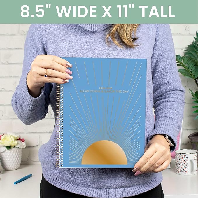- DIMENSIONS & LAYOUT: 8.5" wide x 11" tall. 2 page monthly overview spreads and spacious weekly views run Academic Year, July 2025 through July 2026 -- 365+ days of planning! Weekly views are horizontal and include priority & habit tracking