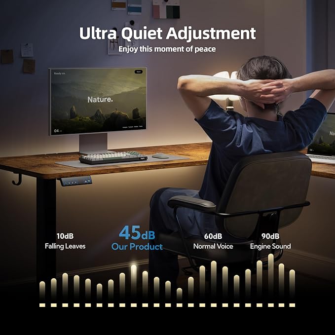 - Quiet Lift Mechanism: The lifting process is designed to be silent, ensuring you can adjust your desk without disturbing coworkers or family members. Even during peak hours, you can quietly change the height, without affecting your environment. The durable construction guarantees smooth, stable movement for years, with no wobbling or instability, even with frequent adjustments.
