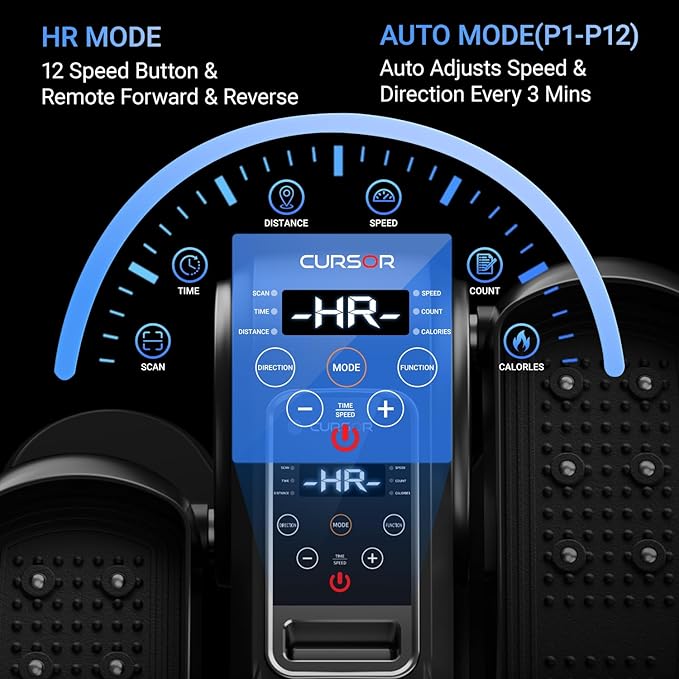 - HR & Auto Mode: Exercise anytime, anywhere. In HR(Manual) mode, you can adjust workout time(15-30min), speed(1-12) and direction (forward&reverse) by remote control or button of the elliptical machine. Then switch "mode" to Auto mode that the speed and direction have been programmed. In auto mode, you can adjust P1-P12 mode by press mode button, the speed of the mini seated elliptical changes every minute, and the direction changes every 3 minutes