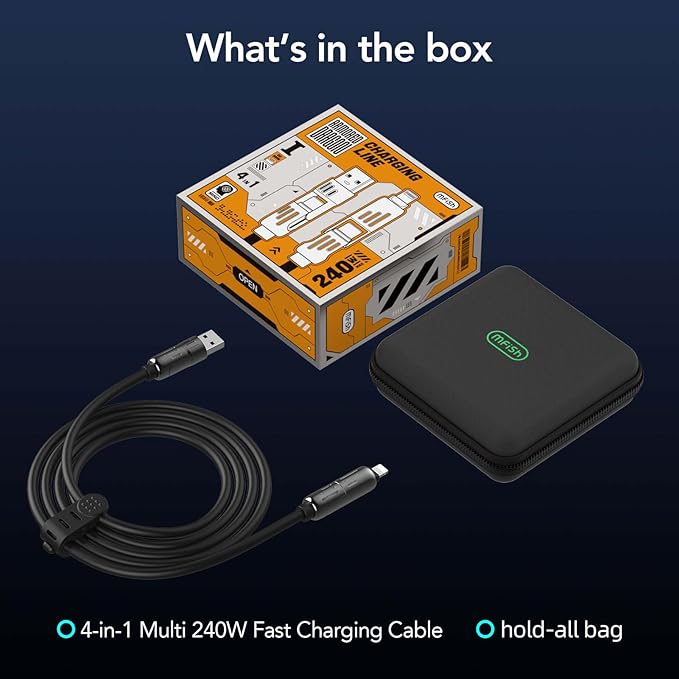 MFish 4-in-1 Universal USB Charging Cable with Carrying Case – 240W Max Fast Charger Cord, USB-A, Dual USB-C & Lighting, for iPhone 14/15/16/17 Series, iPad & MacBook and More(Black, 6.6Ft)