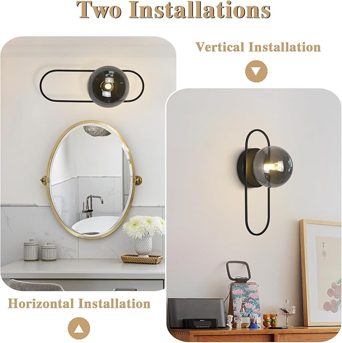 - Globe Wall Sconce with Black Oval Frame: The mid century modern sconce light featuring a matte black 9.4"*7.1" oval frame, surrounding a 4.7” smoked glass globe lampshade and black plate, simplicity and classic, add a stylish look while illuminates your room to create the perfect atmosphere. Ideal for any style, from modern to rustic