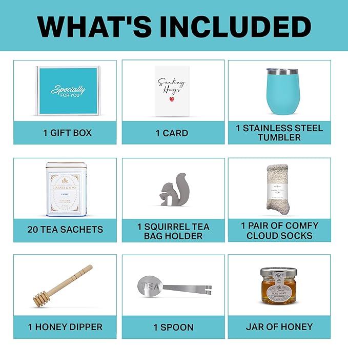 - Thoughtful Gift Set for All Occasions: Show your support and bring joy to your loved ones with a carefully curated get well gift box. Each set includes cozy socks, a reusable teal stainless steel tumbler, premium tea sachets, and a honey jar with a honey dipper. Whether it's for recovery, sympathy, or just to show you care, this gift basket is perfect for any occasion including mothers day gifts, gifts for mom.