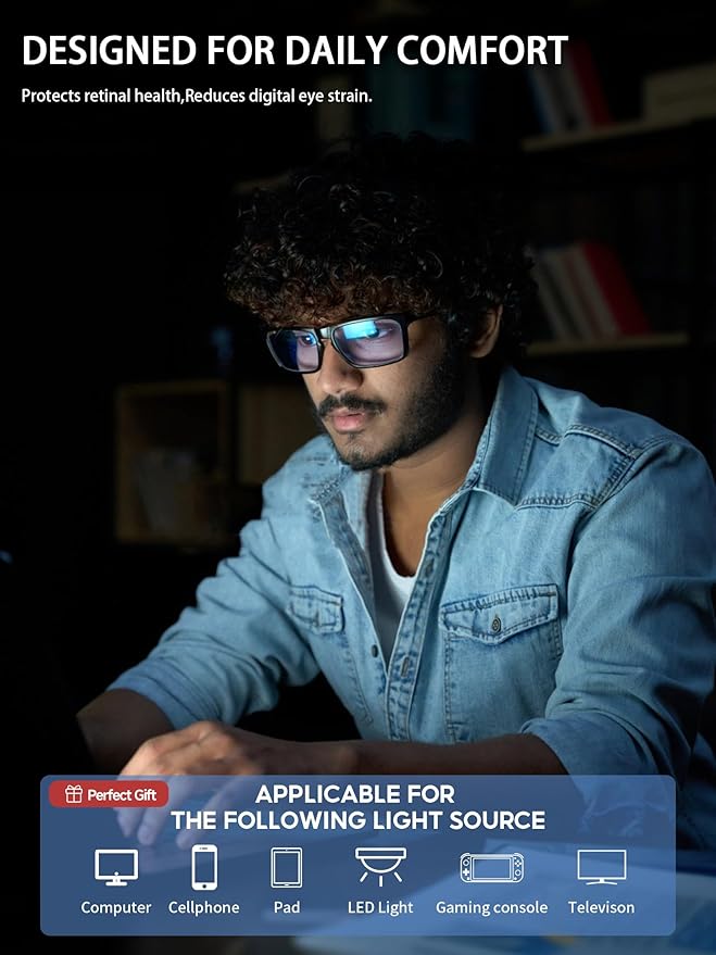 - BLUE LIGHT GLASSES MEN-ENHANCE USE EXPERIENCE: VMJFBJ blue light glasses can help you! only 23g, not bulky, can provide a lightweight and comfortable wearing experience from sunrise to sunset, goodbye blurred vision, dizzy,sensitive,redness. The clear vision allows you not to miss every wonderful picture. With a gamer's vision, it is the ideal gaming accessory!