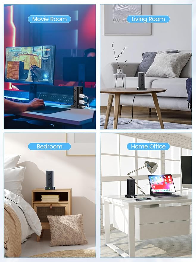 - 【Surge Protector Tower】With overload protection, short-circuit protection, and over-current protection, this device ensures your electronics stay safe. The dependable on/off switch automatically disconnects power, safeguarding your valuable devices and creating a secure charging space. Additionally, multilayer extension cords enhance safety and durability.
