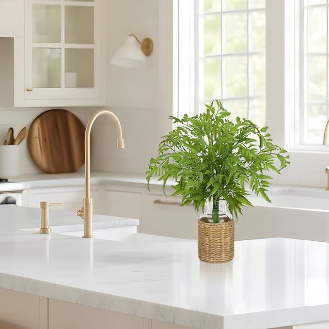 - Premium Vase with Greenery - The fake fern plant are made of plastic material, replicates the shape of a real maidenhair fern leaves, and its durable & flexible material allows the branches to be bent and reshaped. A handwoven rattan sleeve wraps the transparent glass vase, blending earthy texture with contemporary minimalism.Use it to soften sleek kitchens, spa room, entryway consoles, and other spaces. This centerpieces for tables offers year-round elegance without maintenance concerns