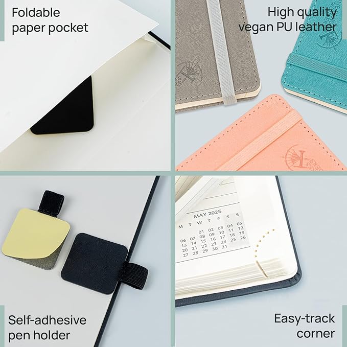 - BUILT-IN EXTRAS: The Monthly Tabs allow you to quickly navigate and locate the current date. Tear-off Corners and Bookmark Ribbons help mark important pages, while an Elastic Closure ensures your planner stays securely closed. Plus, the Foldable Pocket provides the perfect space to store notes, receipts, and important documents.