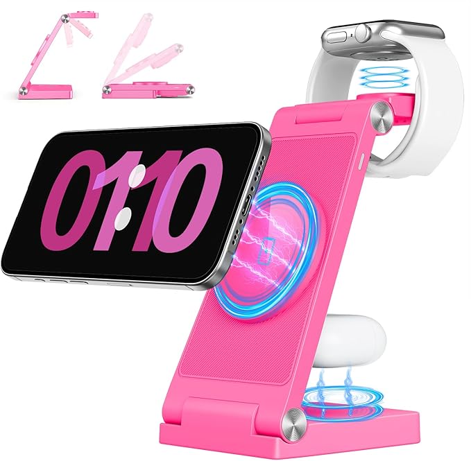 - 3 in 1 Foldable Wireless Charger:Magnetic to i phone charger for multiple devices A pple;easily adjust the vertical or horizontal angle, precise adsorption;non-slip;rapid full charge in 2.5 hours;give you a stable charging experience